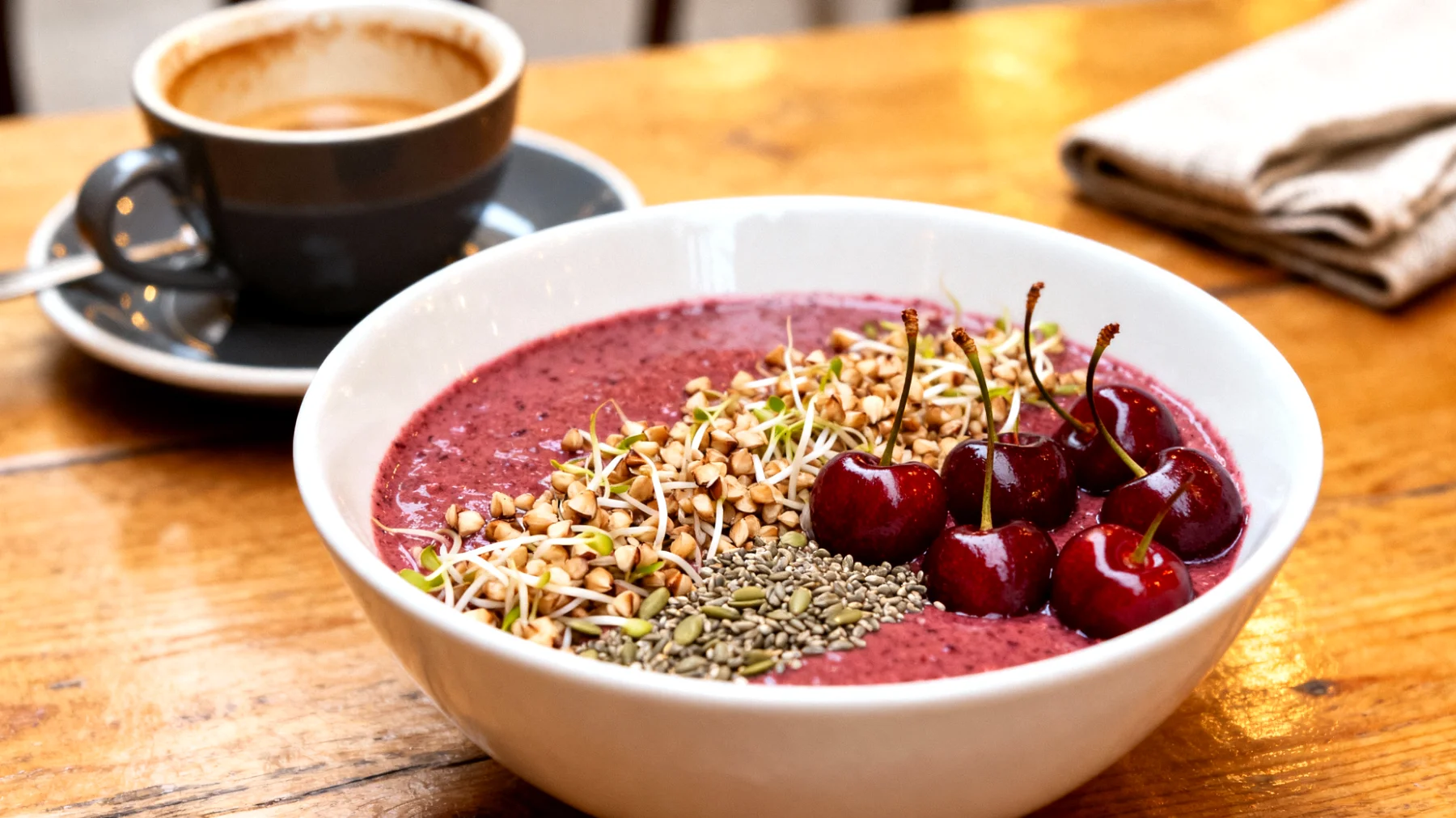 Cinq minutes chrono suffisent pour assembler votre bowl. Mixez une base de sarrasin germé préalablement trempé avec des cerises griottes surgelées, qui conservent la plupart de leurs nutriments et anthocyanes, ajoutez un liquide végétal, puis parsemez généreusement de graines de chanvre. Cette simplicité technique élimine toute excuse liée au manque de temps.